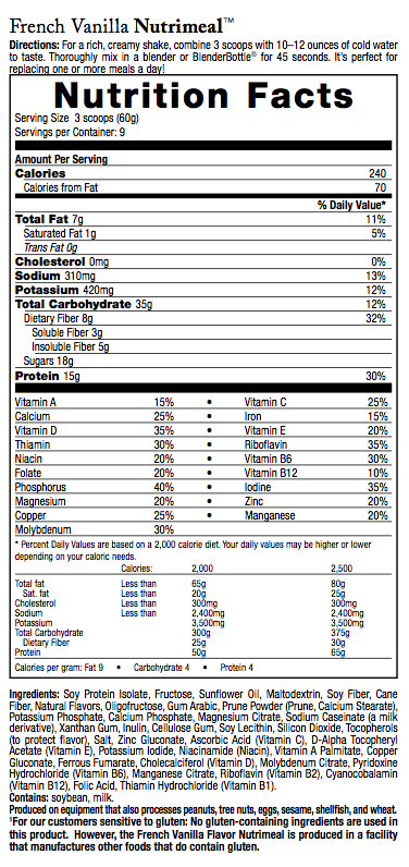 Each serving of Dutch Chocolate and Wild Strawberry Nutrimeal provides 15 grams of soy, whey, and other proteins. French Vanilla Nutrimeal provides 15 grams of soy protein. Soy protein is a complete protein, containing all of the essential amino acids in optimal ratios and in a highly digestible form. Whey protein, which is also easily digestible, is an excellent source of amino acids essential for building a healthy body.